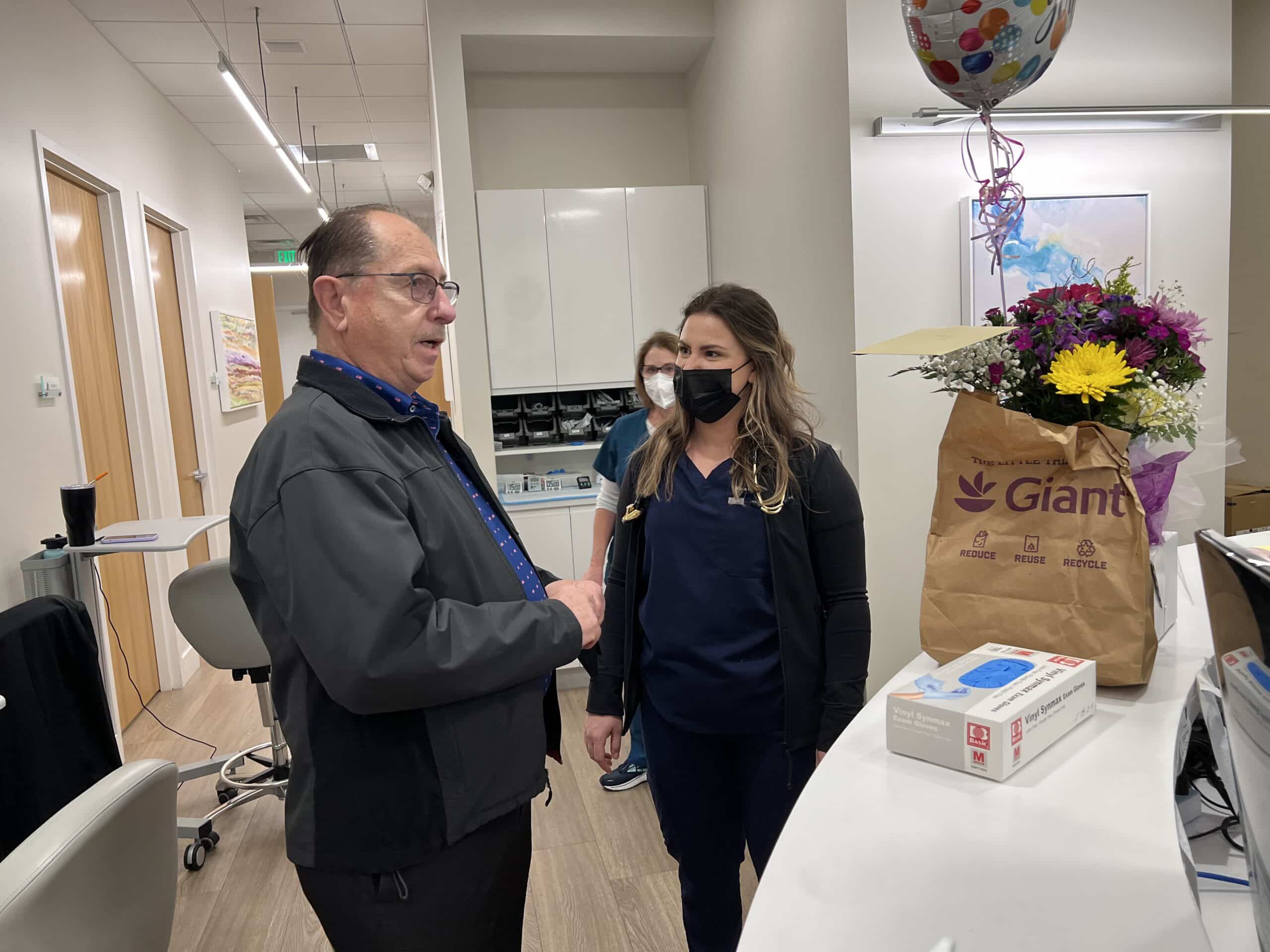 Gene was so grateful. The next week he surprised everyone by returning with candy for the staff and flowers for Kara “We were all humbled and touched by his pouring of gratitude.” said Dr. William Albanese, CEO of Atracare.